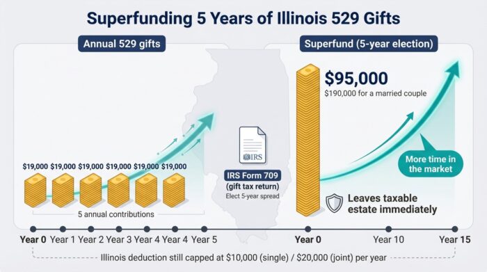 Illinois still caps the deduction at $10,000 (single) or $20,000 (joint) in the year you contribute. Dollars above that ceiling grow tax-free but earn no Illinois credit. If maximizing the state break matters, stagger contributions.