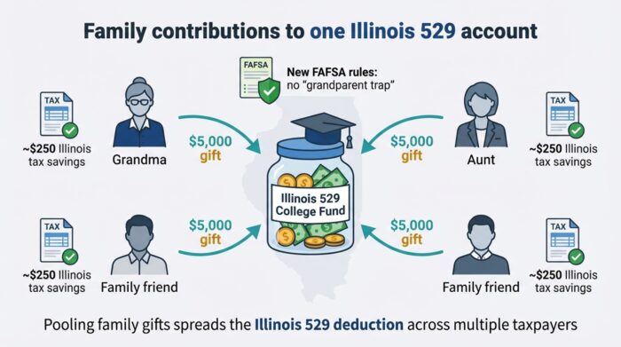 Pooling family dollars does more than enlarge the account; it spreads the Illinois 529 deduction across several returns and makes college funding a group win.