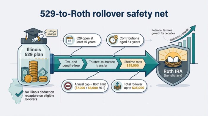 Secure 2.0 permits up to $35,000 of leftover funds to move, tax-free, into the beneficiary’s Roth IRA (subject to a 15-year account age and annual Roth limits). Illinois will not recapture prior deductions on these rollovers.