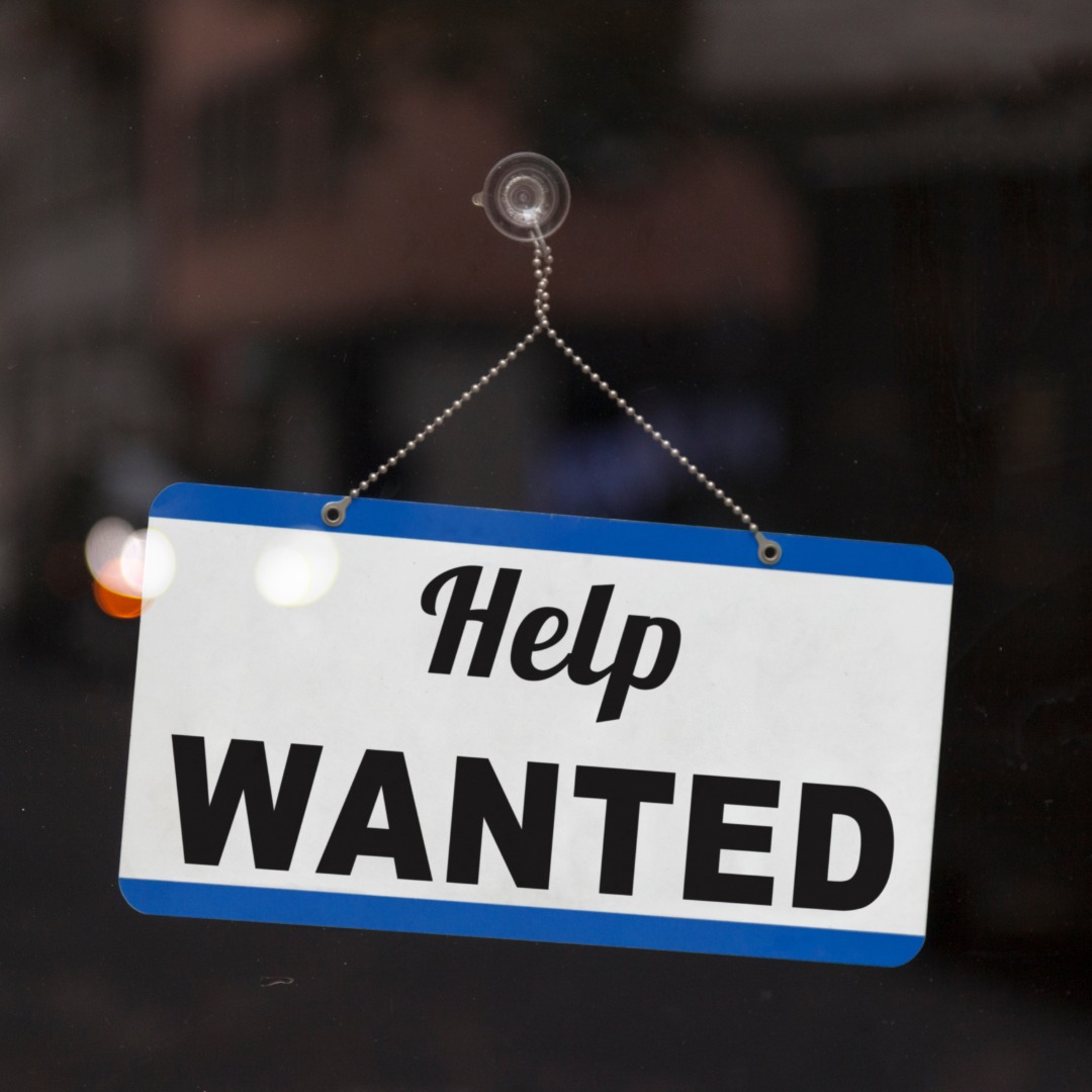 A small blue-and-white sign suction-cupped to a glass surface. The sign has text reading "Help Wanted" on it.